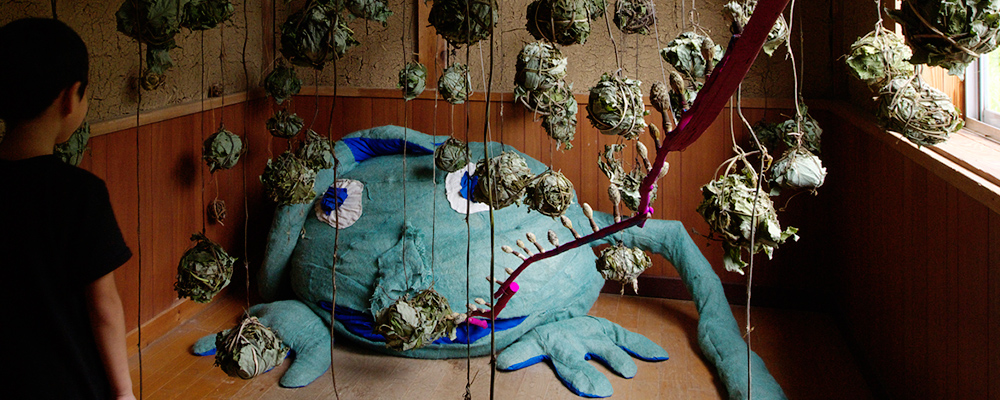 “通常美术馆里连一点细菌都不允许存在,因为担心会破坏作品。可我就是要做个充满生物的美术馆。”田岛征三骄傲地说,“学校附近有小河、有生态池,周围有超过十种青蛙,有某种珍贵的鹰,最近我发现有一只的翅膀断了,我们踩的木地板下面还会有鼬鼠跑来跑去。”在说话间,我发现他坐的椅子下方有个昆虫被蜘蛛网困住了。