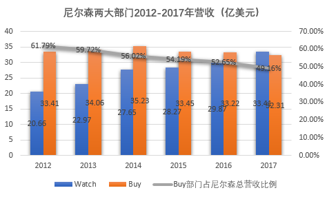2017年,“BUY”业务部门实现营收32.31亿美元,占尼尔森总营收的49.16%。而在2012年,其营收为33.41亿美元,占总营收比例为61.79%。