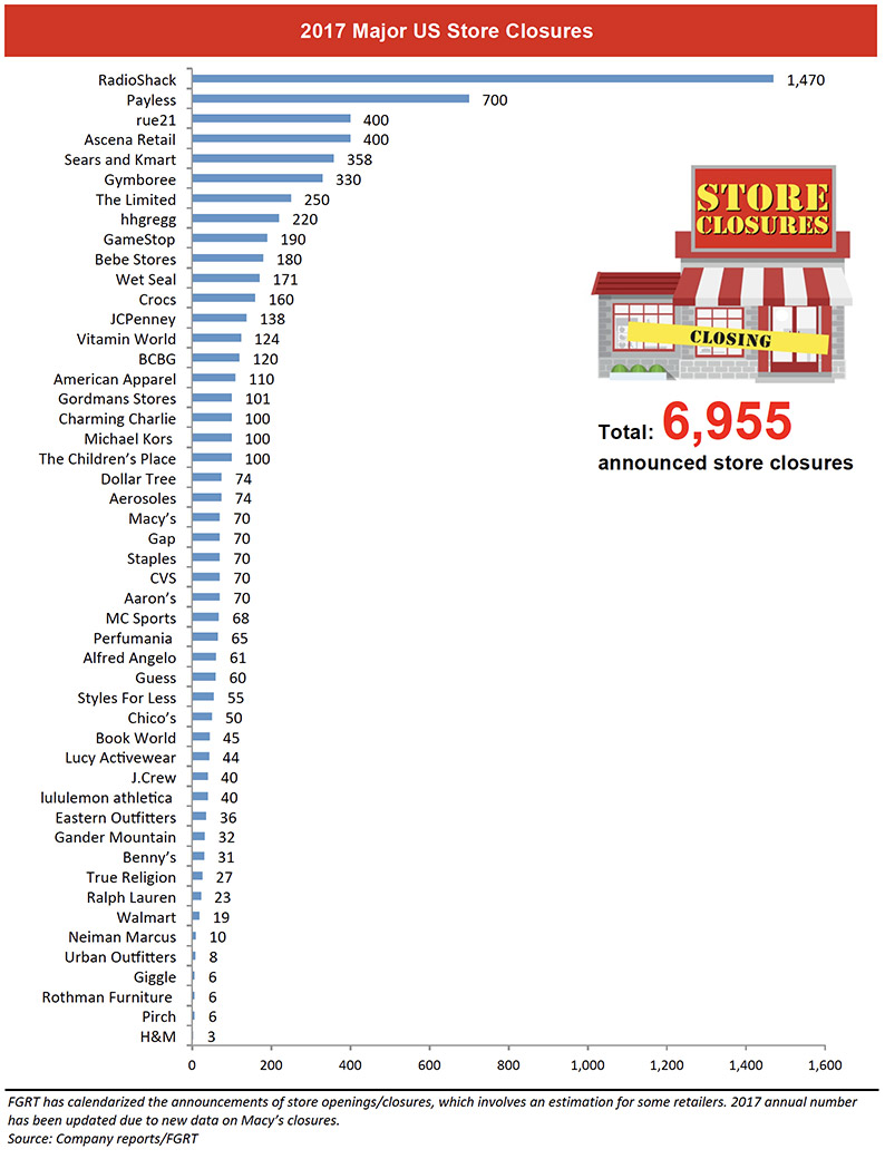 据分析机构FGRT统计,2017年美国主要零售商已公布的计划关店总数达6955间,同比增长229%。另据Business Insider分析,去年美国共有超8005间零售品牌门店结业,其中一半是因品牌破产或直接倒闭,其余则与零售商大规模整顿门店组合以适应消费习惯转变有关。