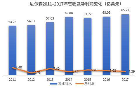 2011-2017年,尼尔森营收保持缓慢增长,但其净利润却逐年下降。2017年,尼尔森净利润4.29亿美元,相比2011年的8.40亿美元,净利润降幅近50%。