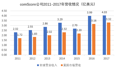 而在2011年,comScore全球营收仅为2.32亿美元,美国市场营收1.72亿美元。