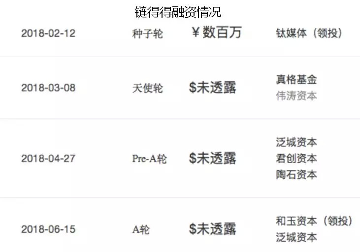 今年 2 月,链得得从钛媒体拆分独立,中旬正式上线。此后从 3 月开始天使轮融资,到 6 月已获得 3 轮融资。