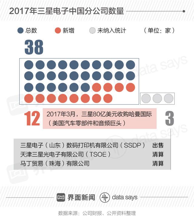 2017年公司财报显示,目前三星中国地区子公司共计38家(包含因哈曼收购新增的12家)。同时,山东、天津、珠海三地分别有一家公司不再纳入计算。