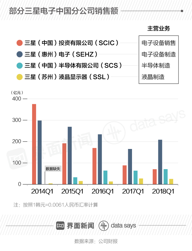 三星电子2018年第二季度财报中,公布了4家中国分公司财务状况。其中,主营电子设备销售的子公司业绩下滑明显,只有主营半导体制造、液晶制造业务的子公司业绩具有较明显的增长趋势。