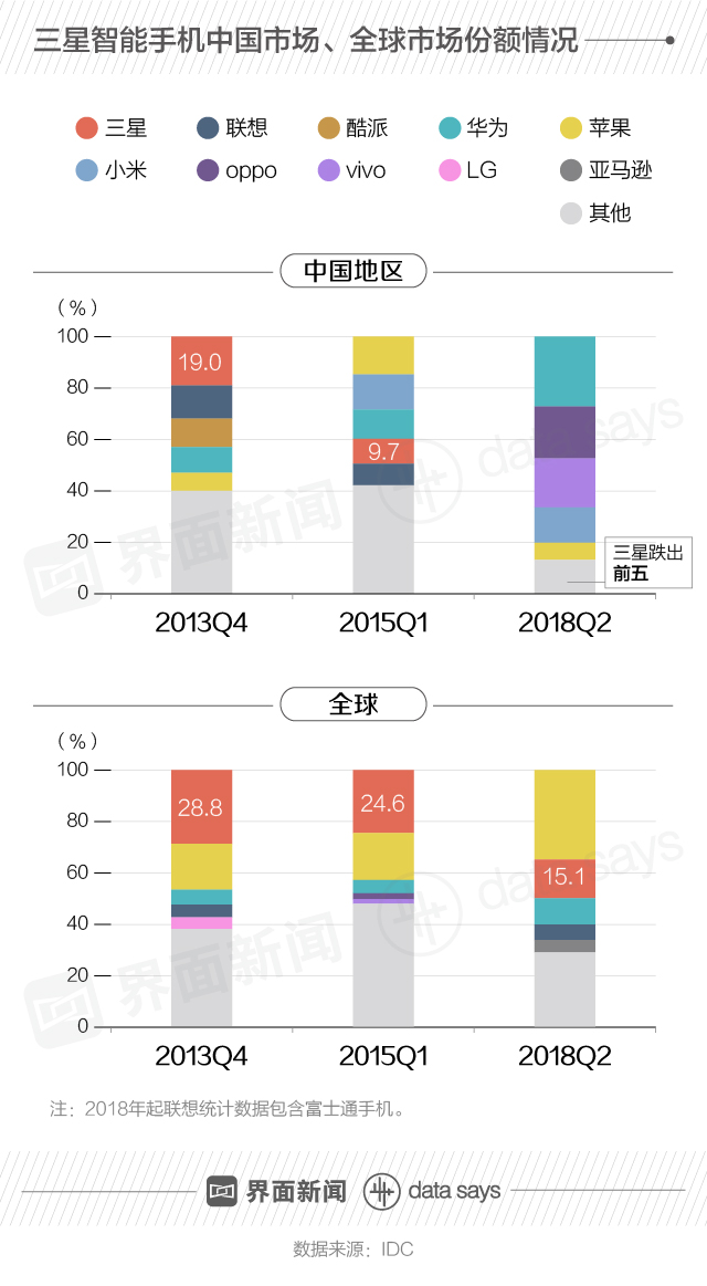 IDC数据显示,三星手机2013年第四季度市场份额占比19%,位列中国智能手机排行榜第一位。2015年第一季度,三星手机市场份额已跌至9.7%,此后再无上榜。