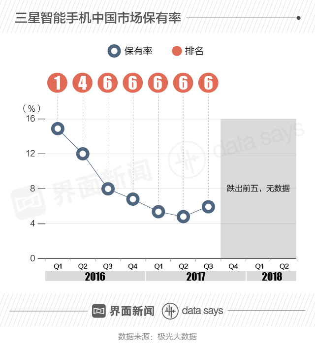 从手机保有率来看,2016年三星中国手机市场保有率达14.9%,稳居第一位。此后,各季度保有率相继下跌,自2017年第四季度起,三星手机跌出榜单,未有统计数据。