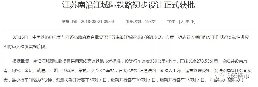 1、就在今天,江苏省交通运输厅公布了《江苏南沿江城际铁路初级设计正式获批》文件