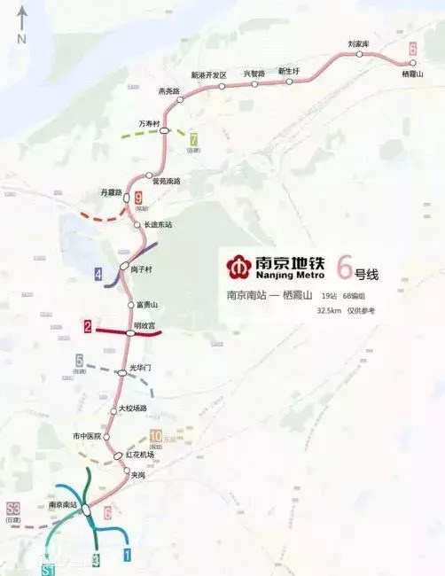 地铁6号线全长32.5公里,全线共设车站18座,北至栖霞山站,南接南京南站,全部为地下线。