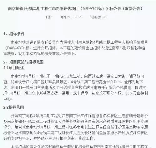 此外,4号线二期工程挂出生态影响评估项目(D4W-XY01标)招标公告近日出炉,拟对江苏南京长江江豚省级自然保护区生态等影响进行评估,为施工做准备。