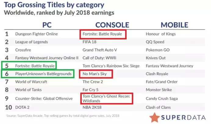 在主机游戏方面,最令人惊讶的是,曾经饱受诟病的《无人深空》开始出现逆转。在7月,该作在PC、PS4以及XboxOne平台的累计总收入达到了2400万美元,活跃玩家人数也超过了200万——这一数据是上个月的10倍。整体来说,该作在7月的强劲表现创下了自2016年8月(首发月)以来最好的月度成绩。