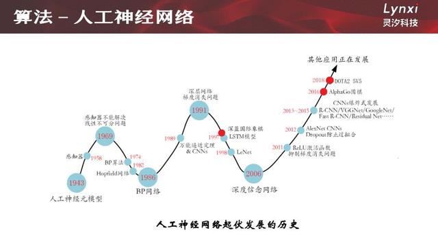 首先是人工神经网络的算法,这是我们最熟悉的人工智能算法。目前最流行最强大的深度学习算法就是最有代表性的人工神经网络算法,这张图片描述了人工神经网络的发展历程。