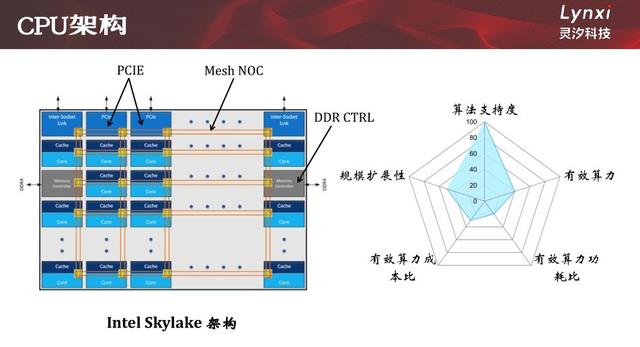 Skylake是多核架构,采用2D Mesh片上网络实现多核调度和互联,每一个核都采用传统的结构,包含计算单元、控制单元等电路。芯片与外界的互联通过PCIE接口实现,同时具有Memory Controller外挂DDR。右边的雷达图是对CPU特点的概括,我会从五个方面来总结CPU以及后面其他计算平台的特性。