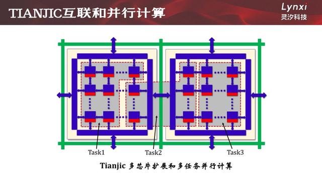 Tianjic的众核架构和2D Mesh片上网络相较于传统芯片架构还有一个极大的优势,就是多核重组特性。因为Tianjic芯片的核阵列中是众核平等的,核与核之间没有主从之分,当多Tianjic芯片组成芯片阵列时,阵列中芯片与芯片之间没有主从之分。因此,在用户眼里,整个芯片阵列就是一个巨大的核阵列,用户可以灵活的用软件来配置自己的任务,把不同的任务同时配置在不同的核组中,真正的实现多任务的并行处理,不管任务之间是有关联性还是没有关联性。这就很像人脑的行为,前面我们分析过,人脑不同的区域有不同的功能,并且能够高效并行的处理各种任务。