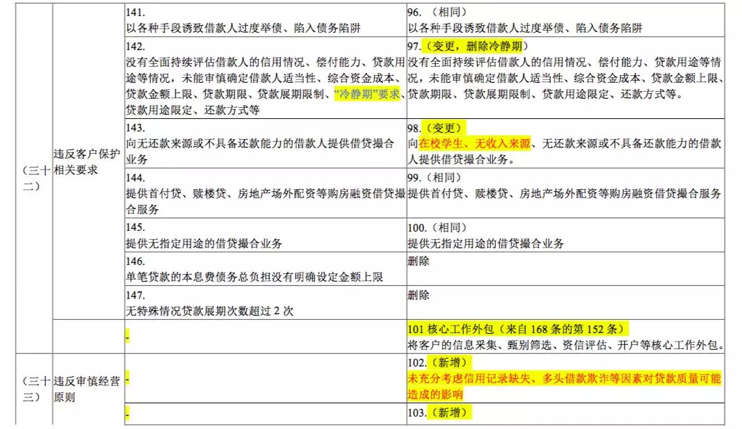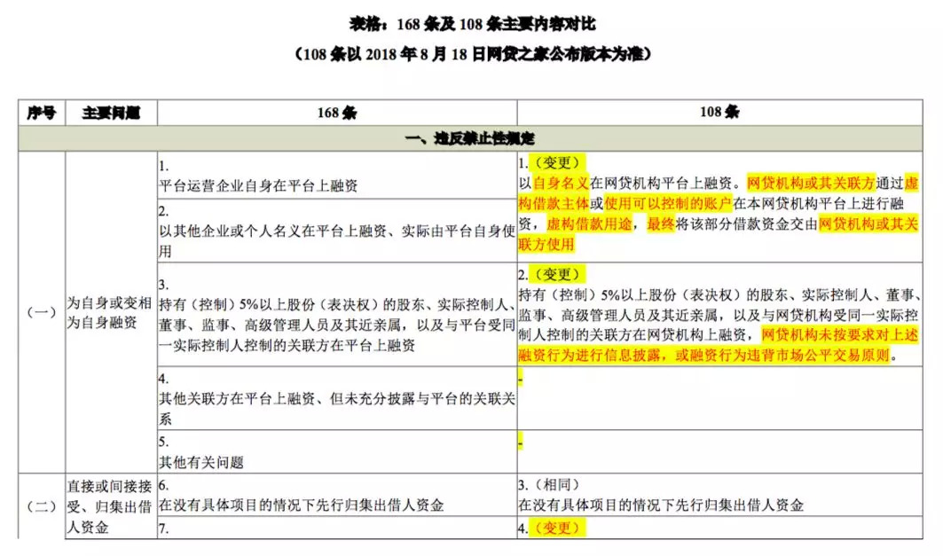 168条禁止核心关联方在网贷机构平台上进行融资,核心关联方融资视为网贷机构自融,108条予以取消,但核心关联方在网贷机构平台上融资需要符合两个条件:1)对融资行为进行信息披露;2)该融资行为须符合市场公平交易原则。