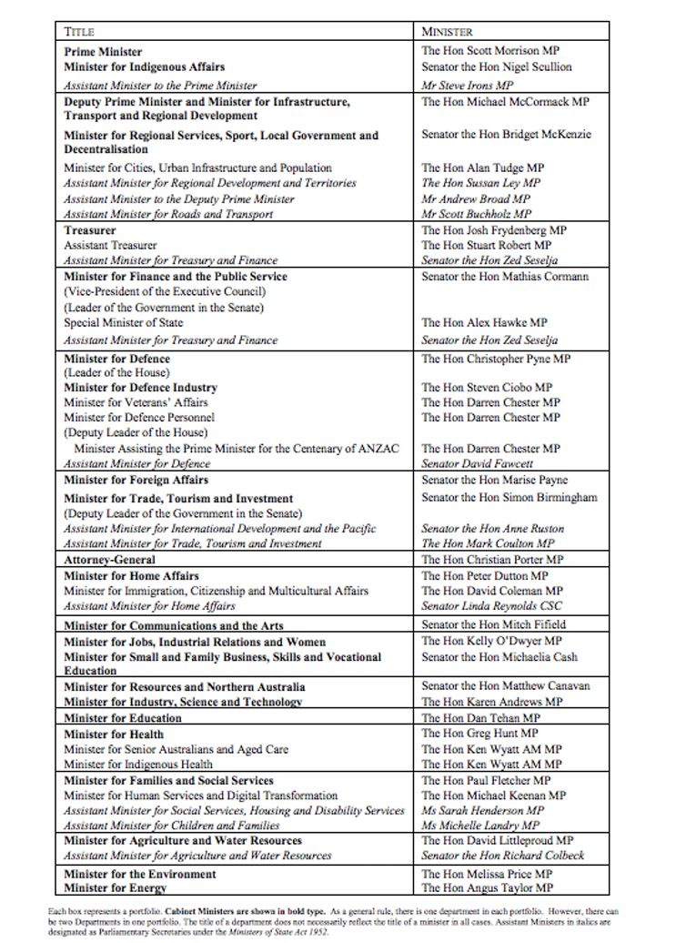 澳大利亚新总理斯科特·莫里森(Scott Morrison)周日下午公布了其新的部长阵容,新的内阁中有一些新面孔和新职能。本次内阁成员的调整也皆在为即将到来的大选做准备。