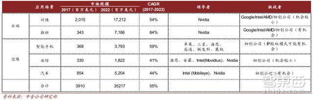 根据中金公司对相关上市 AI 芯片公司的收入统计,及对 AI 在各场景中渗透率的估算,2017年 AI 芯片市场规模已达到 39.1 亿美元,具体情况如下: