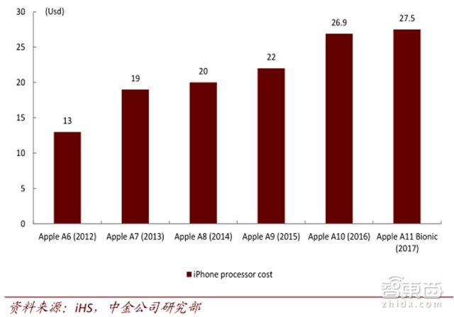 对这些厂商来说,中金公司认为 AI 化的主要作用是提升芯片附加价值与产品单价。根据 IHS的数据,随着硬件性能的增强及针对于 AI 的运算结构不断渗透,苹果 A11 芯片的成本已达到 27.5 美元。