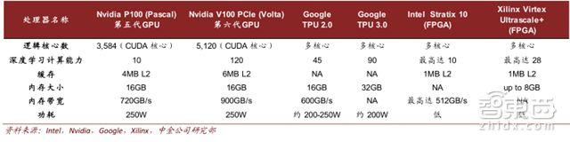 从整个云端训练芯片的市场竞争格局来看,目前 Nvidia GPU 的优势暂时明显,即便是 Google 的一些深度学习训练任务,同样离不开 Nvidia GPU;在 GPU 之外,云端训练的新入竞争者是谷歌的 TPU ,但目前并不对外直接销售;英特尔方面,则在积极布局 CPU+FPGA 异构计算,并持续优化 Xeon CPU 结构;同样深耕 FPGA 的还有 Xilinx ;GPU销量一直甚好的 AMD 也开始切入深度学习训练任务。