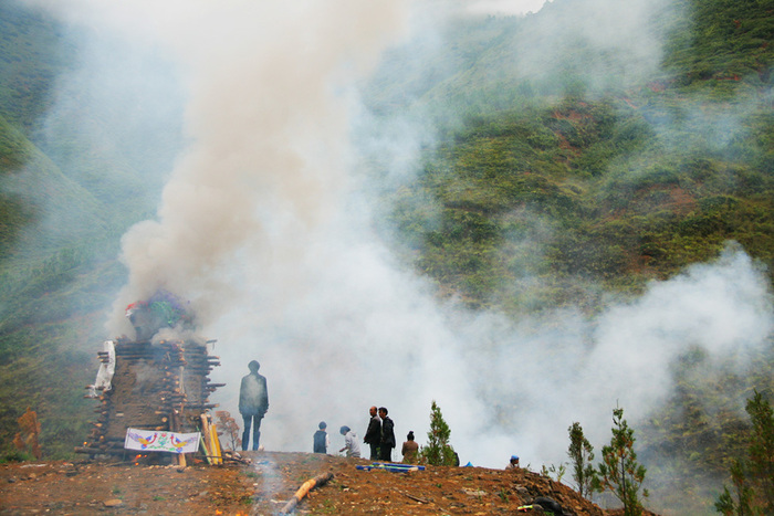 3. 云南泸沽湖摩梭人正在举行火葬仪式。摩梭人死后,不立碑﹑不建坟,死后要捆绑成胎儿状入棺火葬,然后把骨灰撒在山上或埋在树下。因为他们坚信灵魂不灭,在此地消亡正是为了在别处重生。