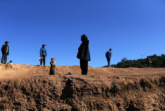 2. 四川大凉山深处布拖县,守灵的亲友们站在阿尔什古家的东边山包上晒太阳,守灵是凉山彝族地区丧葬的一大习俗。
