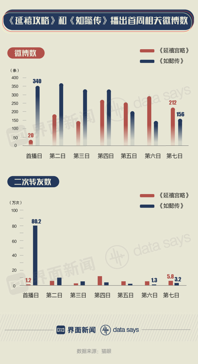 其中,播出前就具有较高关注度的《如懿传》,首播日微博二次转发数高达80.2万次。