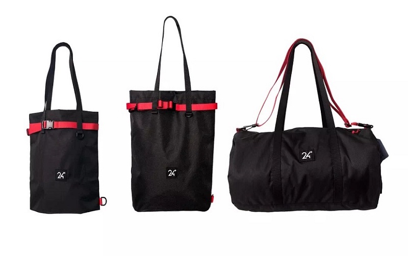 三款24包为两款托特包、一款单肩旅行包。在设计上,两款托特包可以根据不同的场景需要,变身为束口包或者单肩包;而单肩旅行包配有一个侧面小包,可以卸下来单独使用。每个24包内都有一块儿“蓝布”,它的布料来自曾在雅安地震救灾时使用的救灾帐篷。