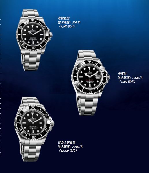 而劳力士第一款真正意义上的潜水表是1953年推出的首款防水深达100米(330英尺) 的腕表——潜航者型(Submariner) 腕表。