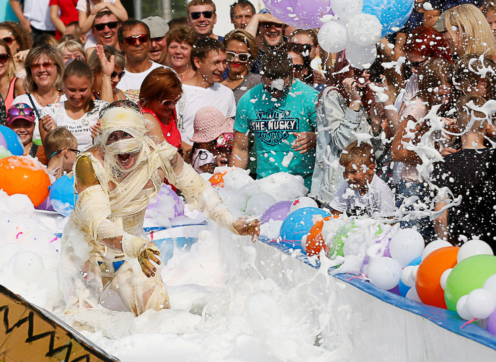 当地时间2018年8月26日,俄罗斯克拉斯诺雅茨克,民众在公园参加水上狂欢活动。一名参加者从充满泡沫的滑道上滑下。