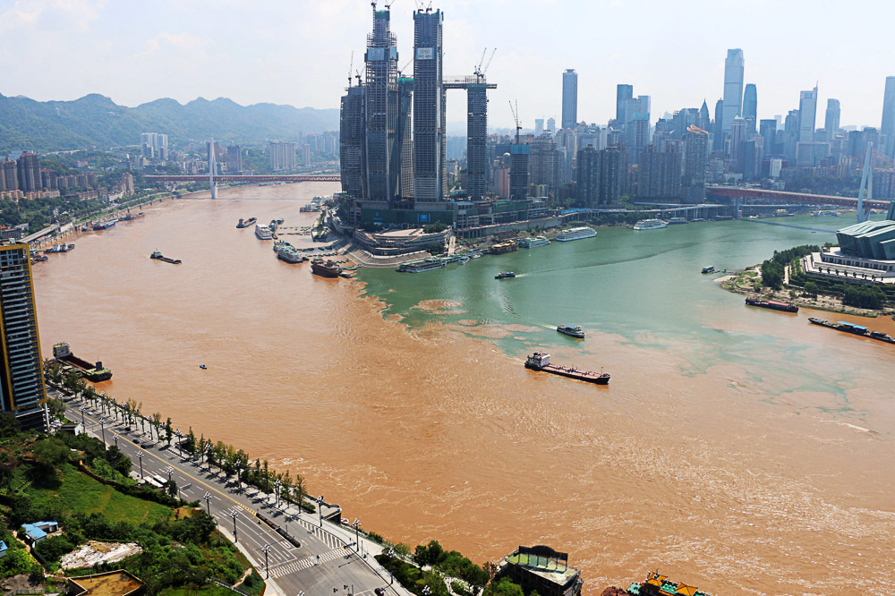2018年8月26日,重庆,长江、嘉陵江江水一清一浊,泾渭分明,黄色和绿色的江水在朝天门处交融汇合后好似一盆“鸳鸯火锅”。
