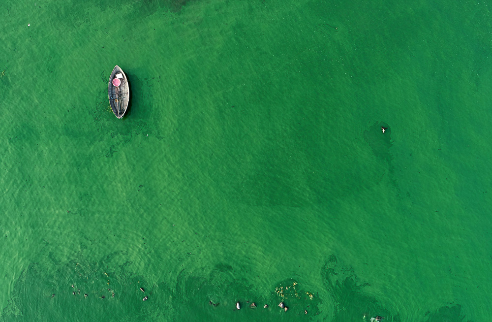 2018年8月9日,安徽合肥巢湖南岸,工人们正在湖面上打捞蓝藻。