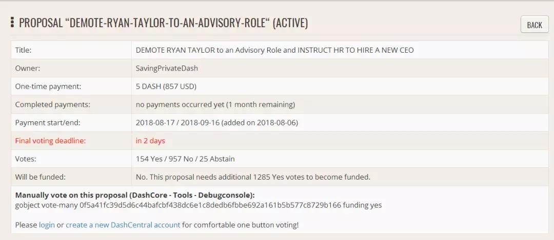 近期,该网站上出现一则标题为“将RyanTaylor降级为顾问角色”的提案。提案的作者控诉道,“Ryan反复违反承诺、不遵守项目进度的最后期限,摧毁了市场对DASH的信心。DASH的价值曾经高达0.09BTC,现在为0.02BTC。除了让自己获益数百万美元之外...... Ryan完全没有遵守2016年的承诺。”