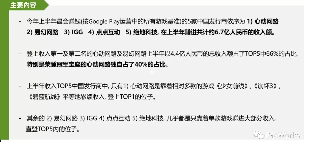 荣登收入冠军宝座的心动网路上半年通过4款游戏的运营,共赚进约2.7亿人民币的收入额,占了收入TOP5中国发行商合计收入额的40%。