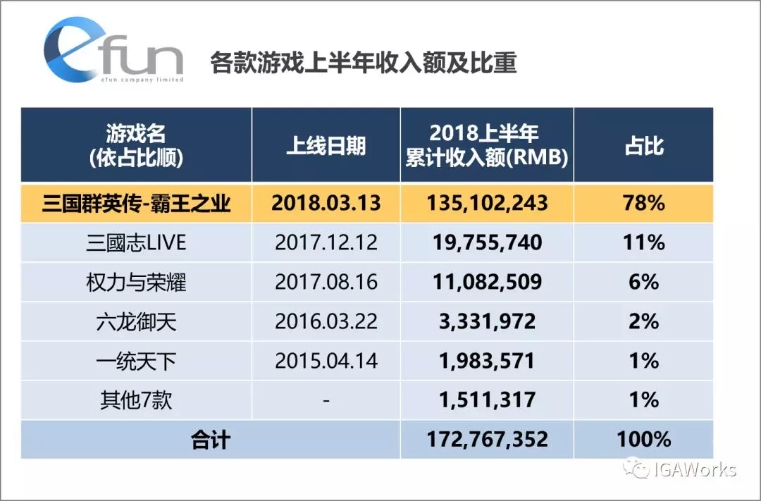 此外, 虽然易幻网路在上半年通过运营12款游戏, 赚进了1.7亿人民币的收入额, 但实际上《三国志LIVE》(11%),《权利与荣耀》(6%), 《六龙御天》(2%) 等游戏在收入额的贡献度上, 与占比最大的《三国群英传-霸王之业》差异悬殊。