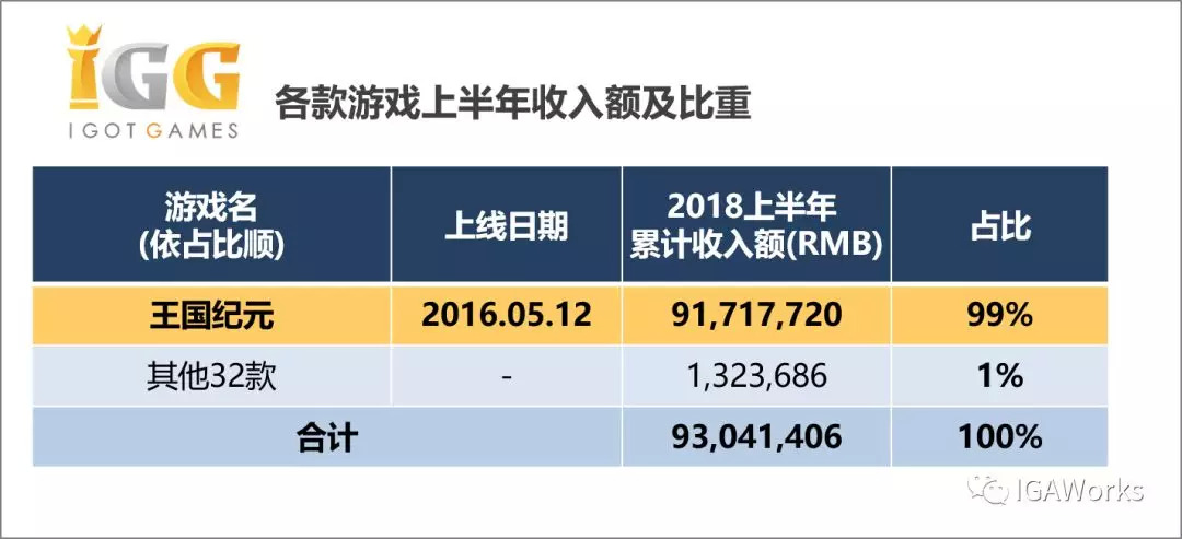 第三名的IGG上半年的累计收入约为9,304万人民币。同比TOP5内的其他发行商, 虽然第三名的IGG在今年上半年运营的游戏款数最多,但在收入方面,《王国纪元》以9,172万人民币占了99%的比重,所以IGG实际上是单靠《王国纪元》一款游戏登上第三名的位子。