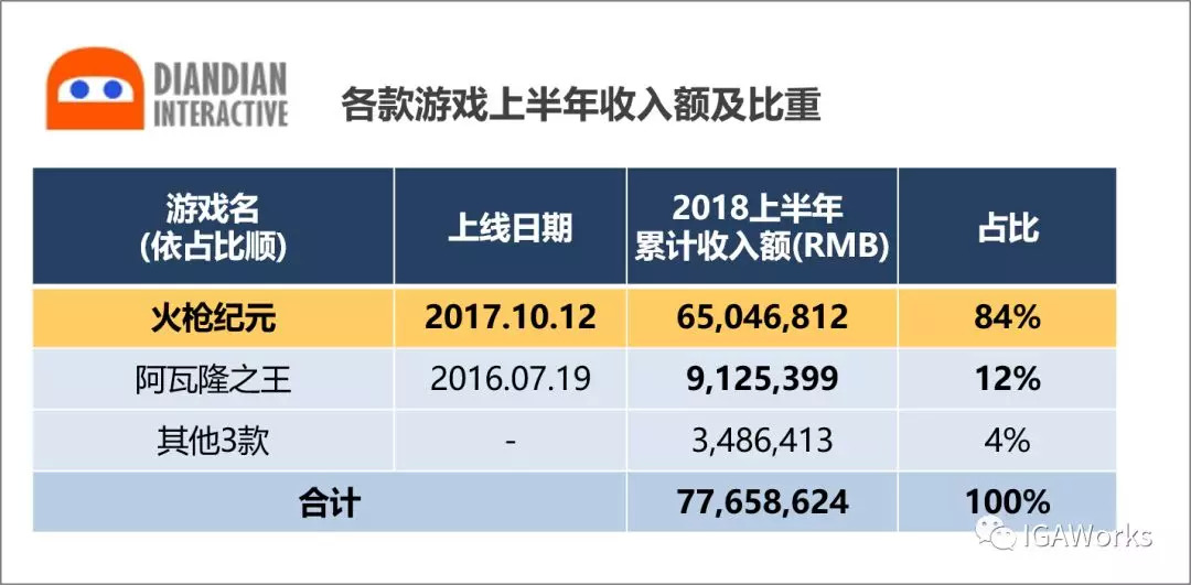 点点互动以7,766万人民币的收入额成为收入第四的中国发行商,其中《火枪纪元》的收入额为6,505万元,占了84%的比重。其次点点互动2016年在韩国推出的像是《阿瓦隆之王》(12%), 《圣光之誓Valiant Force》(3%)等游戏, 虽说随着时间经过在今年上半年的收入占比不大, 但仍然持续的创造收入。