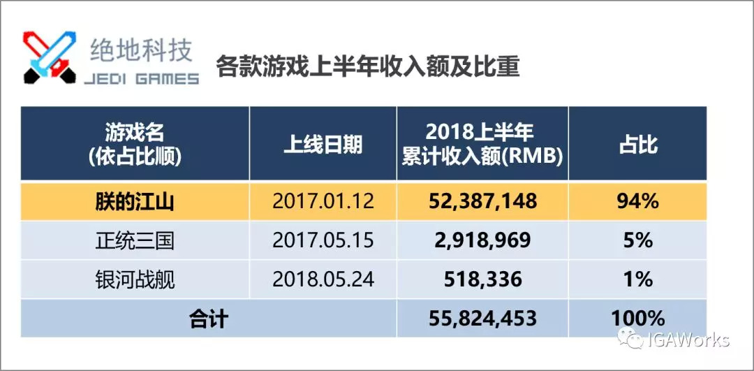 绝地科技上半年运营中的3款游戏累计收入额约为5,582万人民币。其中,《朕的江山》以5,239万元占了94%占比,同时与绝地科技的其他两款游戏《正统三国》, 《银河战舰》的收入额有着非常大的差距。