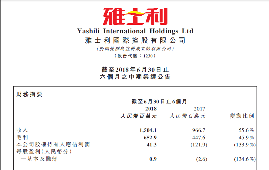 日前,雅士利国际(01230.HK)在港发布了截至2018年6月30日止六个月之中期业绩公告,实现收入约为15.04亿元,同比增幅在55%左右;