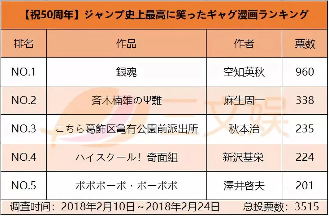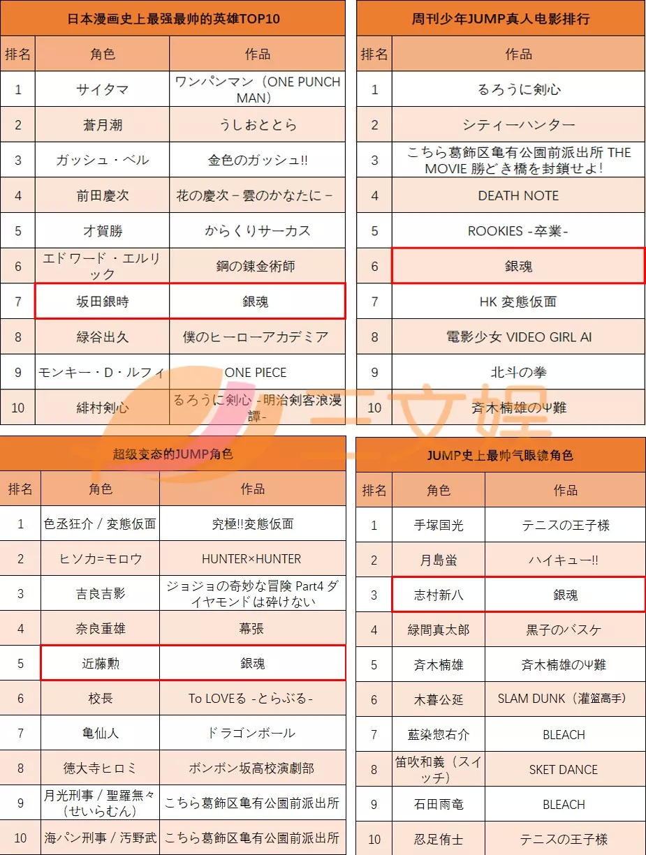 2018年2月,为祝贺《周刊少年JUMP》创刊50周年,日本网站goo曾做过一次“JUMP史上最搞笑漫画”投票活动,《银魂》以960票高票当选第一名,是第二名的2.8倍,占总票数的27.3%。