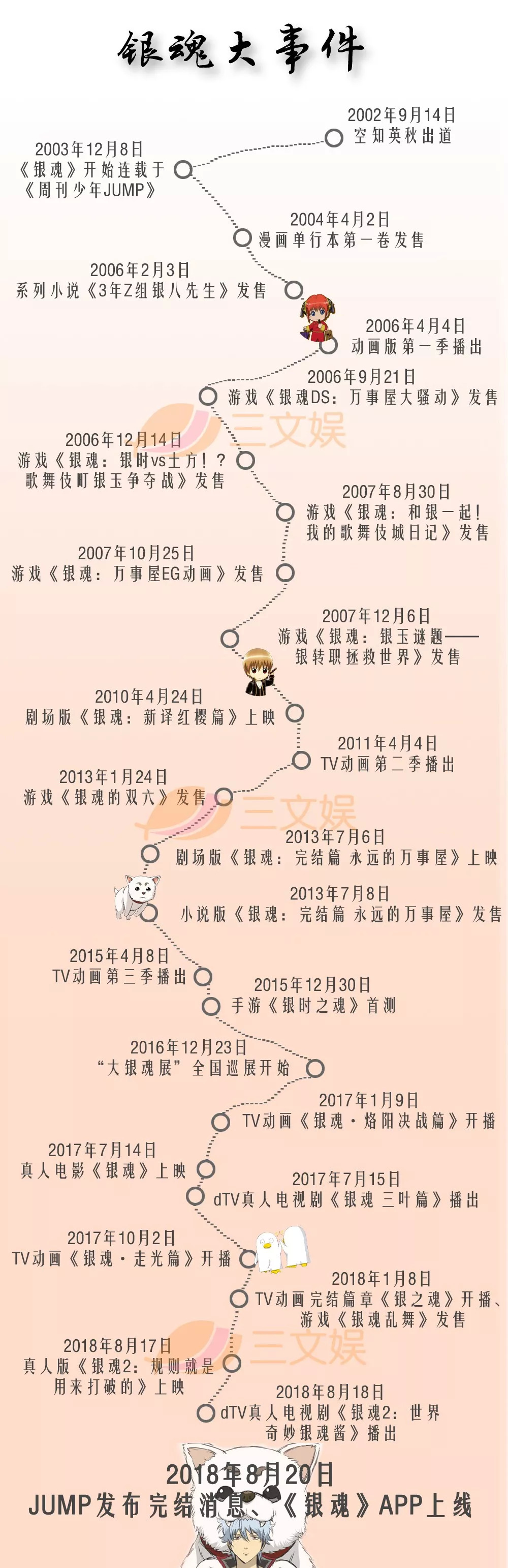不过,近期围绕“银魂”的话题新闻也是不少。小栗旬主演的真人电影《银魂2:规则就是为了打破而存在》8月17日上映,上映3日票房突破8亿日元;8月18日,配信平台dTV原创真人电视剧版《银魂2:世界奇妙银魂酱》开始播出,已更新两集;而JUMP也在8月20日上线了《银魂》专属APP,可观看包括漫画、动画、小说等《银魂》几乎所有的资源。《银魂》漫画的完结也和它的故事一样,热热闹闹。