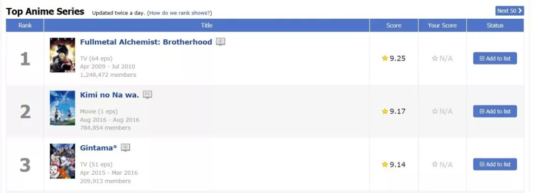 在全球最大英文番剧评分网站MyAnimeList上,第三季《银魂゜》以9.14分在TV动画TOP榜上排名第三。而“正在播出动画”热度榜上,第四季的《银之魂篇》同样排在第三位。