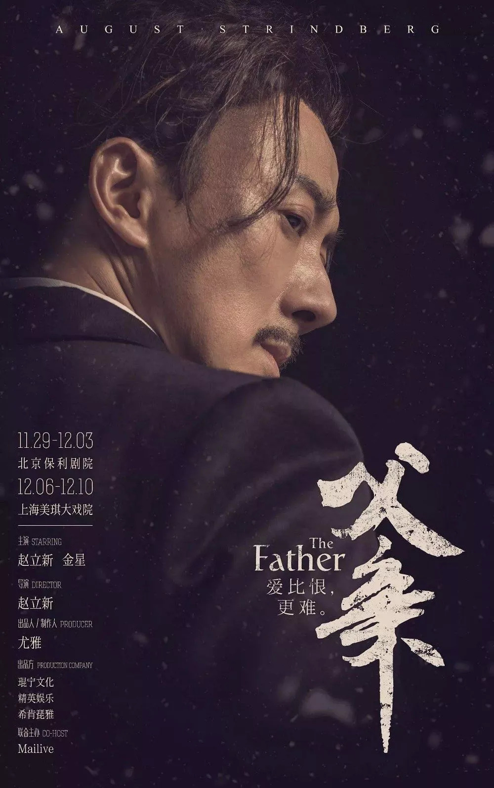 创作于1887年的《父亲》是被誉为“世界现代戏剧之父”的瑞典著名剧作家斯特林堡第一部自然主义戏剧,对这部作品有着极深情节的赵立新,从去年冬天到今年盛夏,先后两次将它搬上国家大剧院的舞台,他用深厚般的内力驾驭着这部深刻、严肃、诗性又不羁的戏剧,以正邪参半的灵魂游走在舞台上。