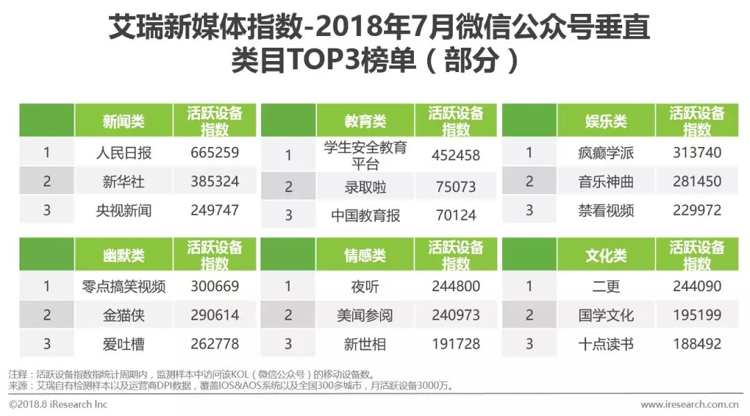 根据艾瑞咨询新媒体指数,2018年7月,微信公众号总榜中,典型垂直类目TOP3的月度活跃设备指数均超过180000,其中,新闻类TOP3活跃度最高,分别为人民日报、新华社及央视新闻三个传统媒体公众号,月度活跃设备指数达到665259、385324和249747。