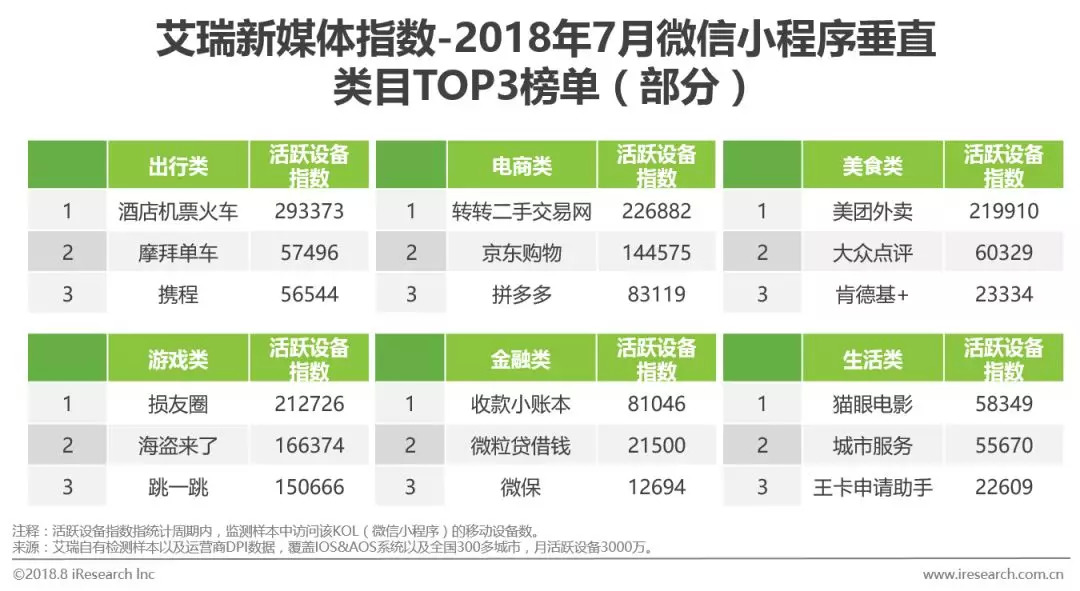 微信小程序总榜中,典型垂直类目TOP3的月度活跃设备指数均超过10000,其中,游戏类TOP3活跃度最高,此外,微信小程序TOP30中,其他游戏类小程序表现也较好,多元小游戏玩法契合了用户打发碎片化休闲时间的需求。