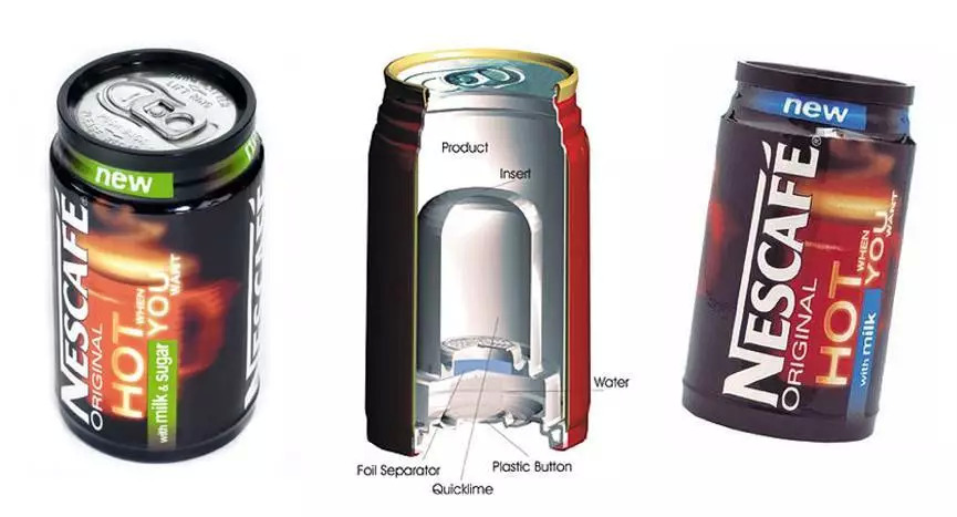 其实自热咖啡在市场上早已有之。雀巢曾在2001年开发过一款名为Nescafe Hot When You Want的自热咖啡,其原理是将水和生石灰分别放置在罐内夹层中,通过化学反应产生热量。按下底部的按钮后,消费者可以在三分钟内喝到60度的热咖啡。