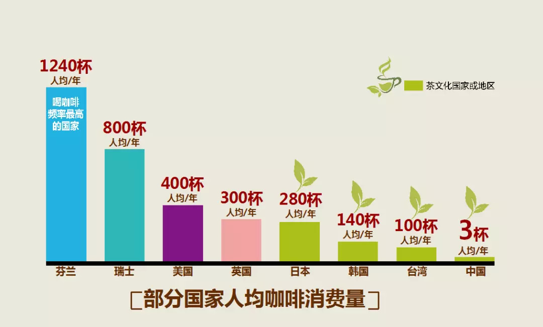 中国人均咖啡消费量与其他国家对比。图片来源:吉斯咖啡