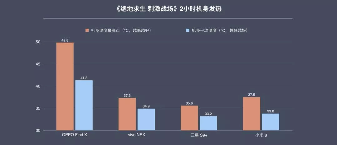 此外,在爱否科技实测对比中,同等条件下OPPO Find X和vivo NEX游戏两小时机身机身温度都要高于其他主流手机,OPPO Find X较为严重,机身最高温度高过三星S9+ 14.2℃,给人以明显“灼热感”。