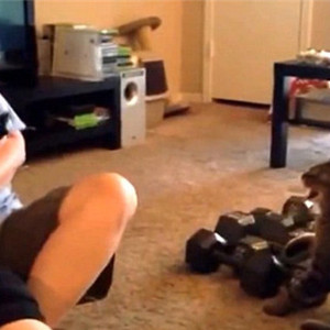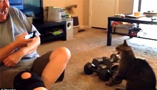 Falm跳了起来,越过地上的一堆哑铃,冲到Penny面前,抬起爪子,扑到Penny腿上。在这个过程中,Falm的尾巴一直处于紧绷状态。接着,Falm对着Penny恶狠狠呲牙,并用猫爪对她发出了攻击。全程堪称快、准、狠。