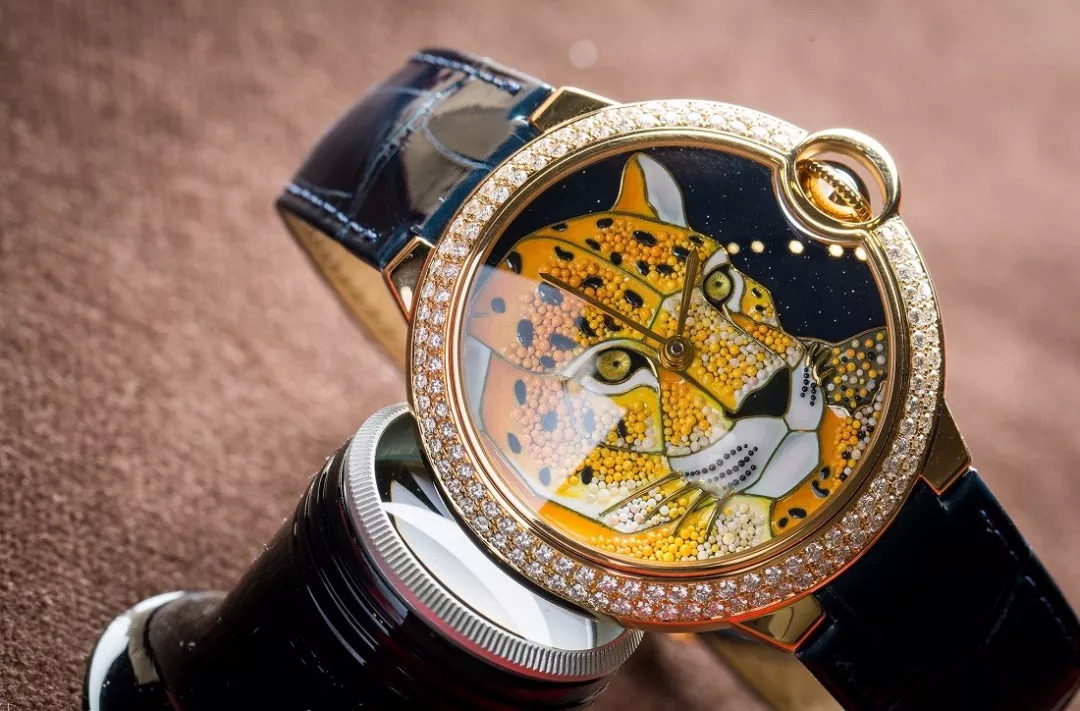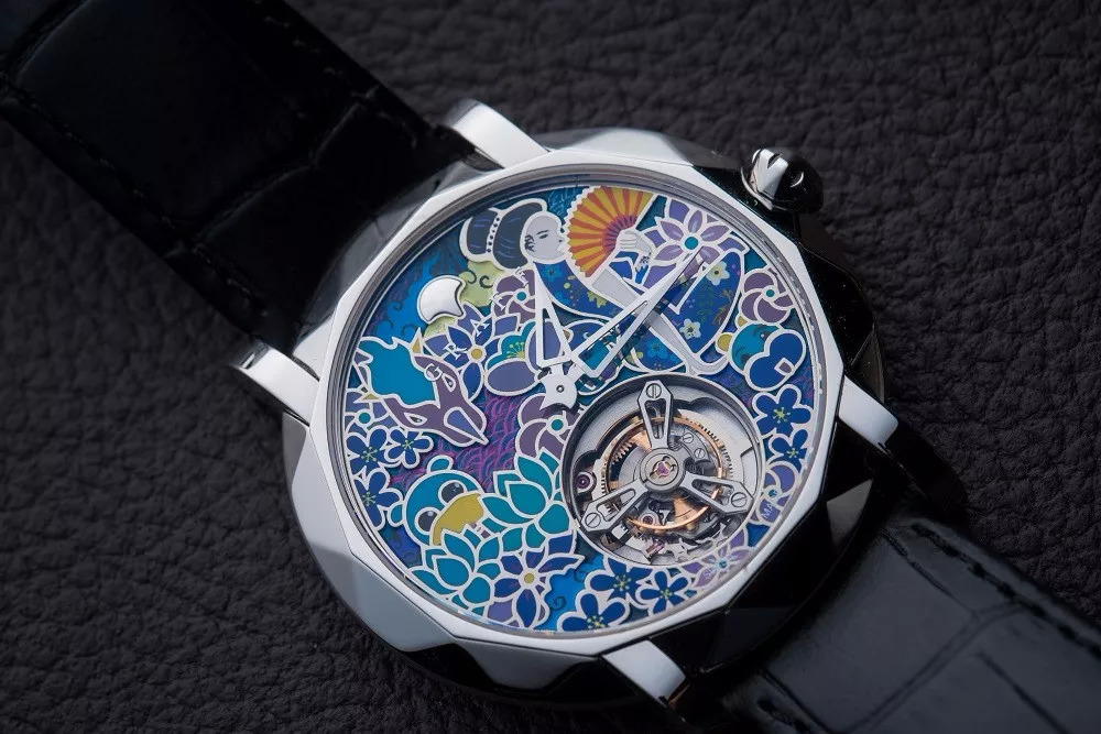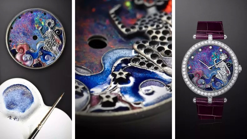 这块表是限量生产的,每件产品上都有至少10种色彩,而且都不一样。在制作珐琅之前,通过手工雕刻制作出表盘的底板。然后在珐琅表面通过微型绘画进一步制作出浮雕。完成一块这样的表盘耗时长达40小时。