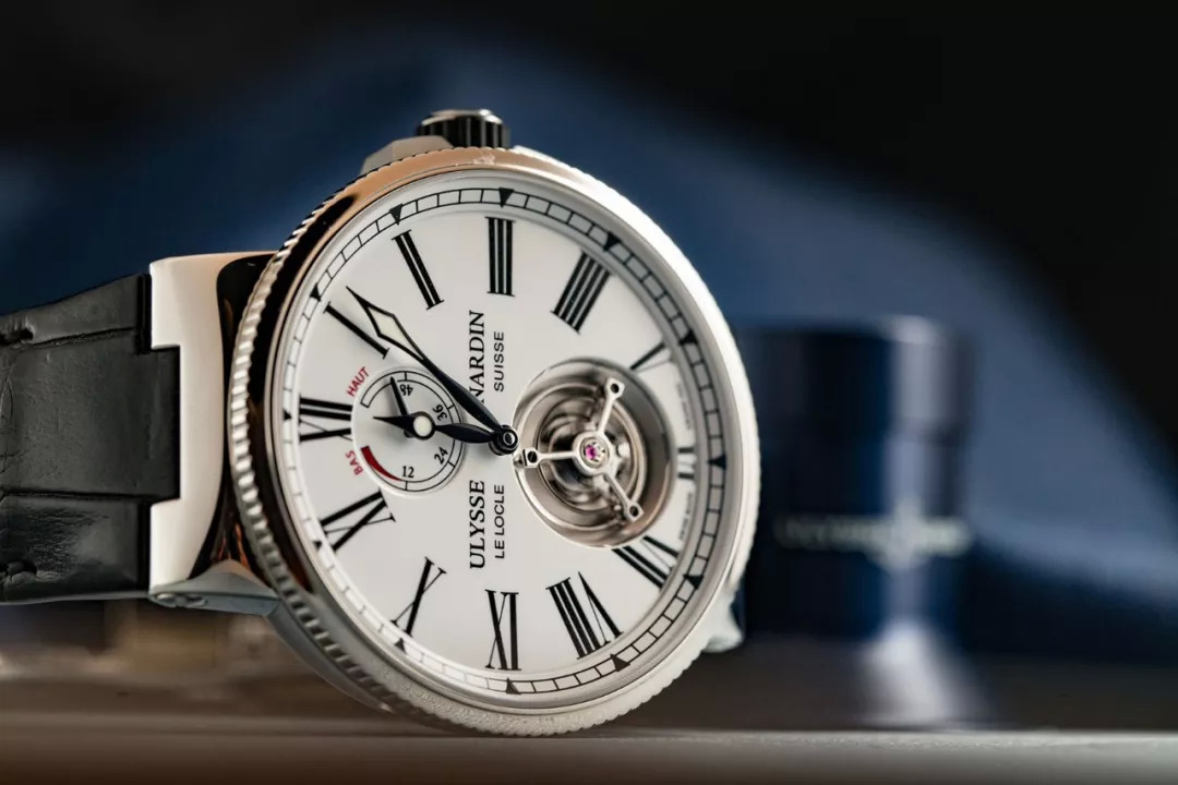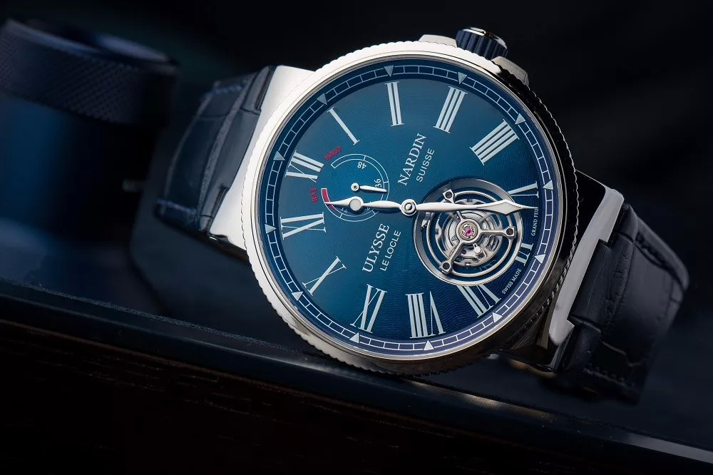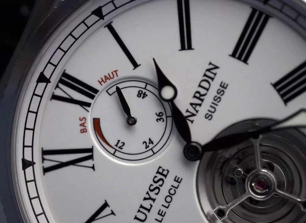 这款表上的蓝色珐琅表盘是由加工单位Donzé Cadrans提供的,这是一家为雅典所有的专门制作手工珐琅表盘的单位。航海大明火珐琅陀飞轮上应用了蓝色Grand Feu珐琅技法。Grand Feu(翻译成“大火”)要求高温窑来融化珐琅粉末。