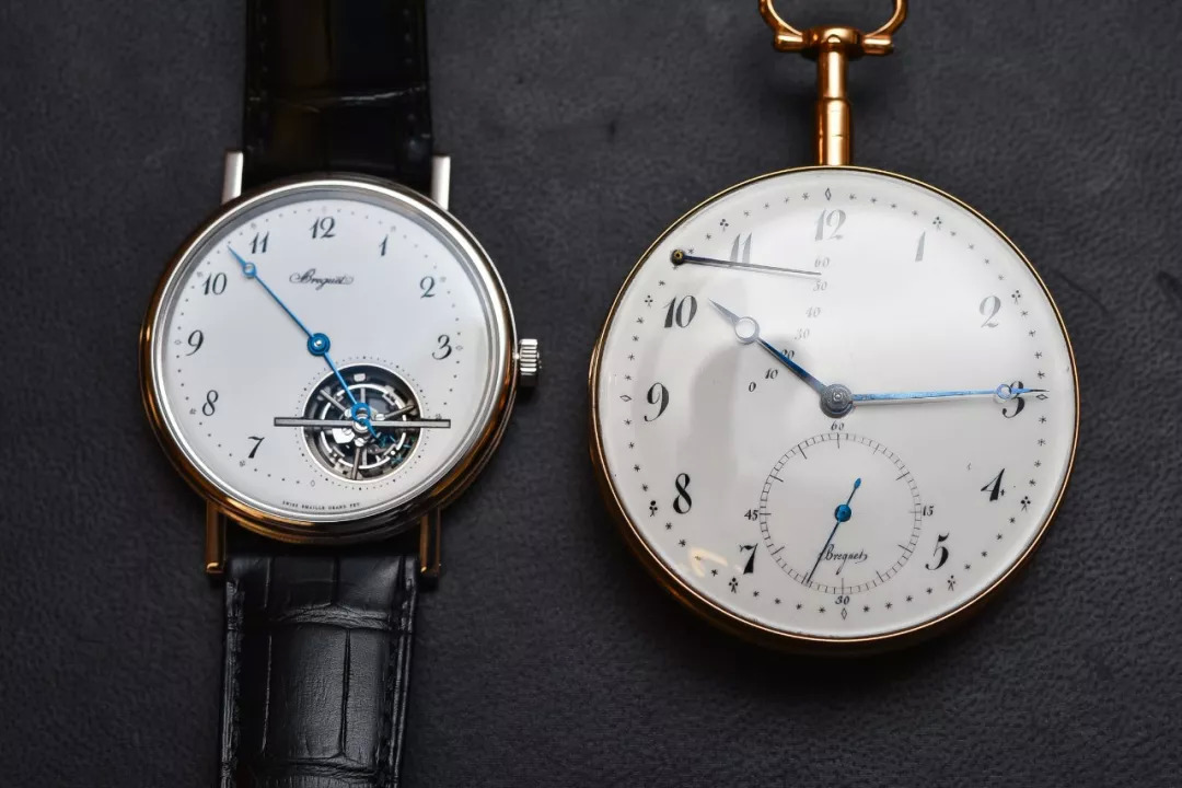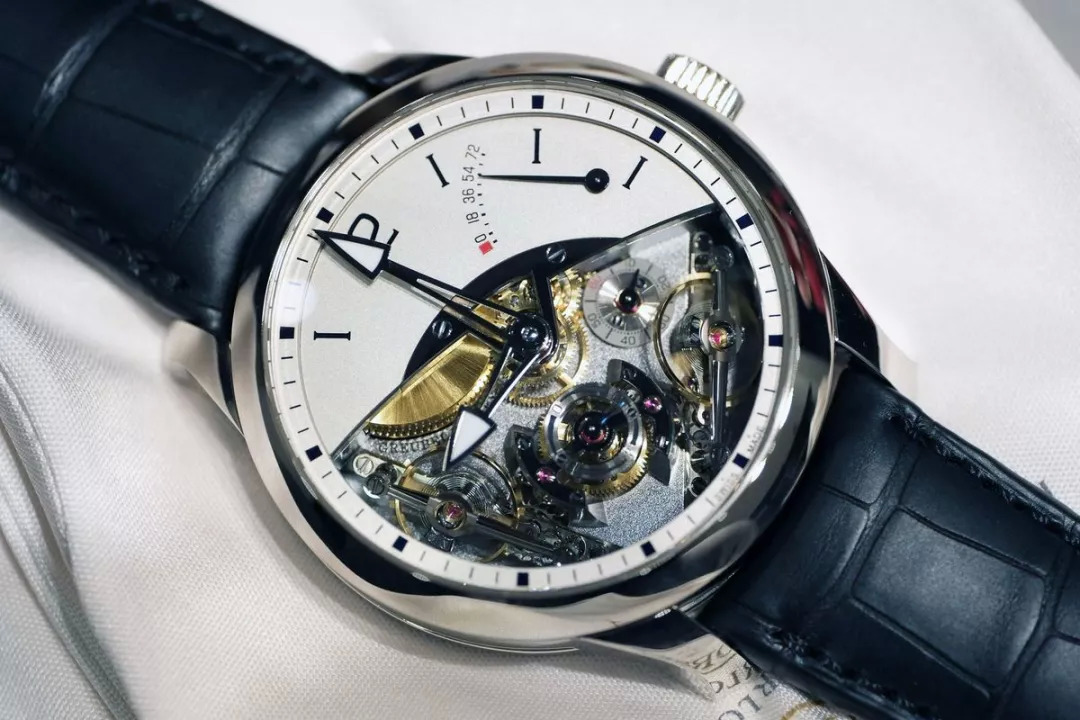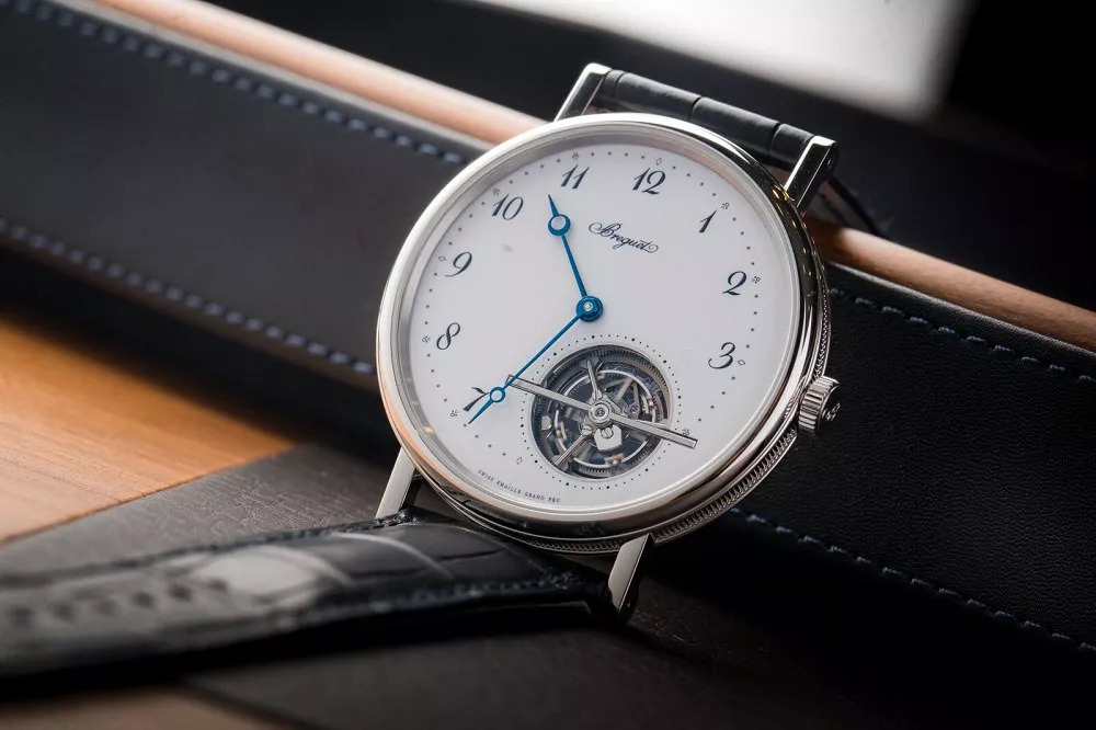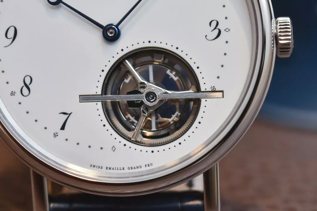 纯粹的白色珐琅表盘的优雅气质是这款超薄陀飞轮腕表的主要特征。这种设计非常巧妙,手工切边的陀飞轮棒,顶部是一颗尖晶石,安置在5点钟的位置。显示有宝玑风格阿拉伯数字的钟盘字环在偏离中心的位置11点钟处,跟陀飞轮面对面。